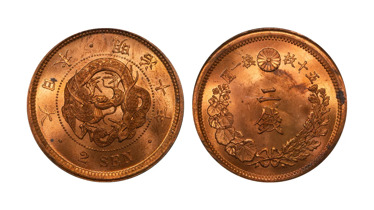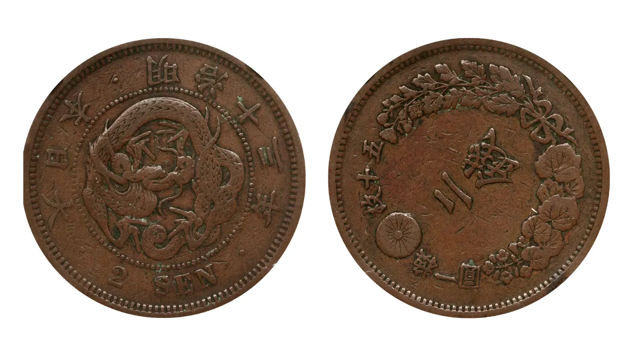 1873年(明治6年)から1884年(明治17年)まで発行された2銭銅貨は、表面に竜、裏面に菊花紋章が刻まれた日本の近代銅貨です。