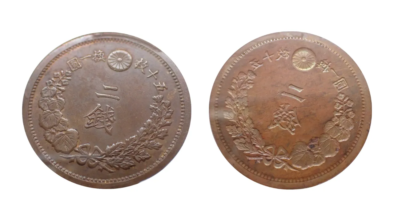 2銭硬貨は製造年代が古く、経年による摩耗や酸化で表面の色調や刻印の鮮明さが異なるため、熟練した鑑定士でなければ真価を見極めにくい硬貨です。