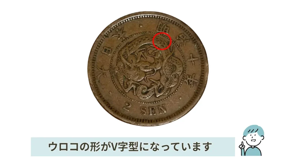 2銭硬貨は竜のウロコの形によって「角ウロコ」と「波ウロコ」の2種類が存在しており、デザインの違いがそのまま査定額にも影響します。